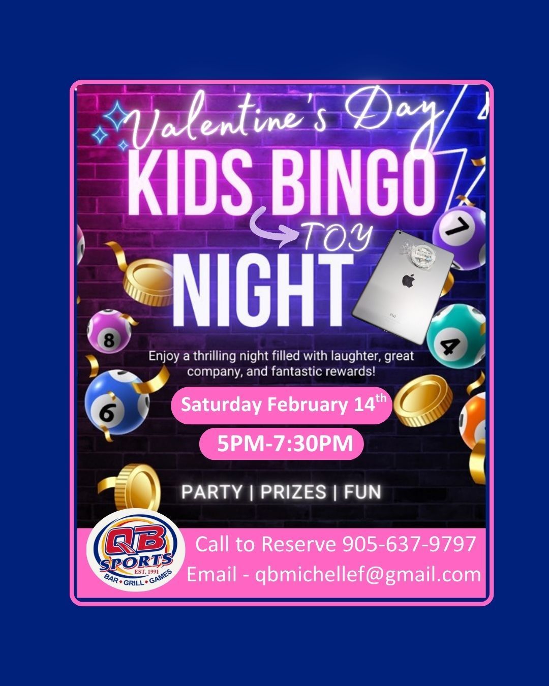 Valentine’s Day Kids Toy Bingo Night at QB Sports Bar Grill Games | Family Fun in Burlington